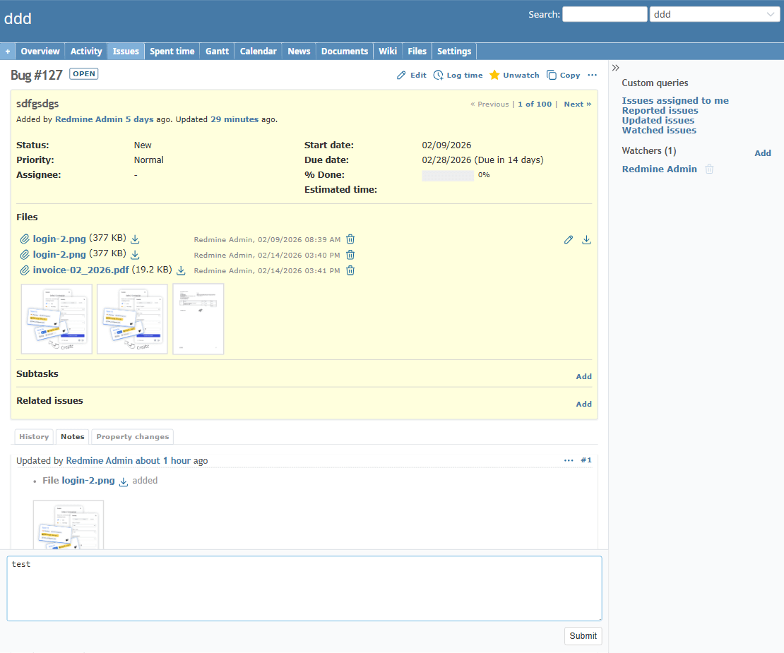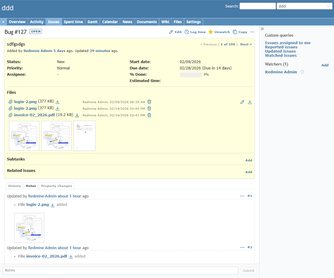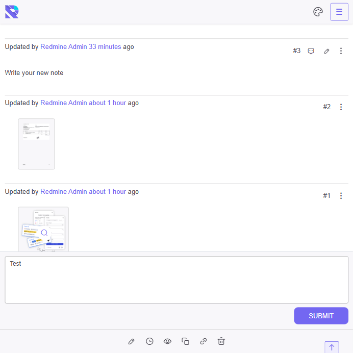 top scrolling to find the notes area. re-note places a simple note editor at the very bottom of the issue page, right where you finish reading the task history. Add a note in seconds and save it as a native Redmine journal entry—no custom tables, no external storage, and notes appear in the standard history with notifications handled by Redmine. The button stays inactive until you type, and labels use Redmine’s built-in translations for a consistent UI across languages.